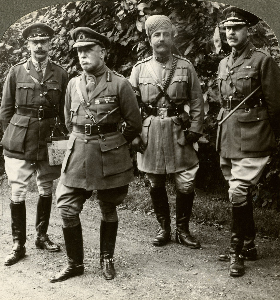 Sir John French, Commander-in-Chief of the BEF, France, World War I, 1914-1915. Field Marshal French (1852-1925) with aides-de-camp at headquarters. He was the first Commander-in-Chief of the British Expeditionary Force (BEF) in World War I. He was replaced by his deputy, General Douglas Haig, in 1915 and served as Commander of British Home Forces for the rest of the war. Stereoscopic card detail.