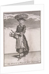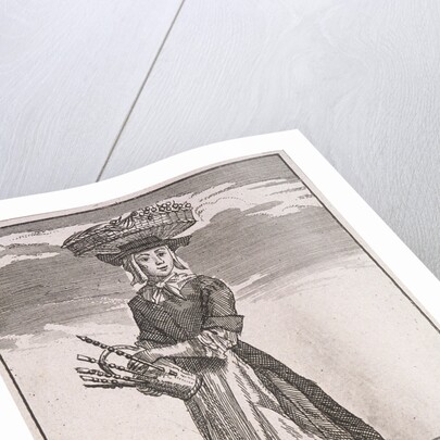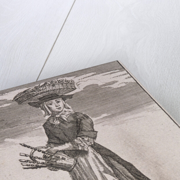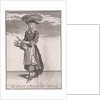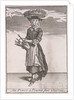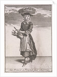 'Six Pence a Pound fair Cherries', (c1688?). A cherry seller, carrying a basket on her head. The cherries appear to be skewered on sticks. From Cries of London, (c1688?).