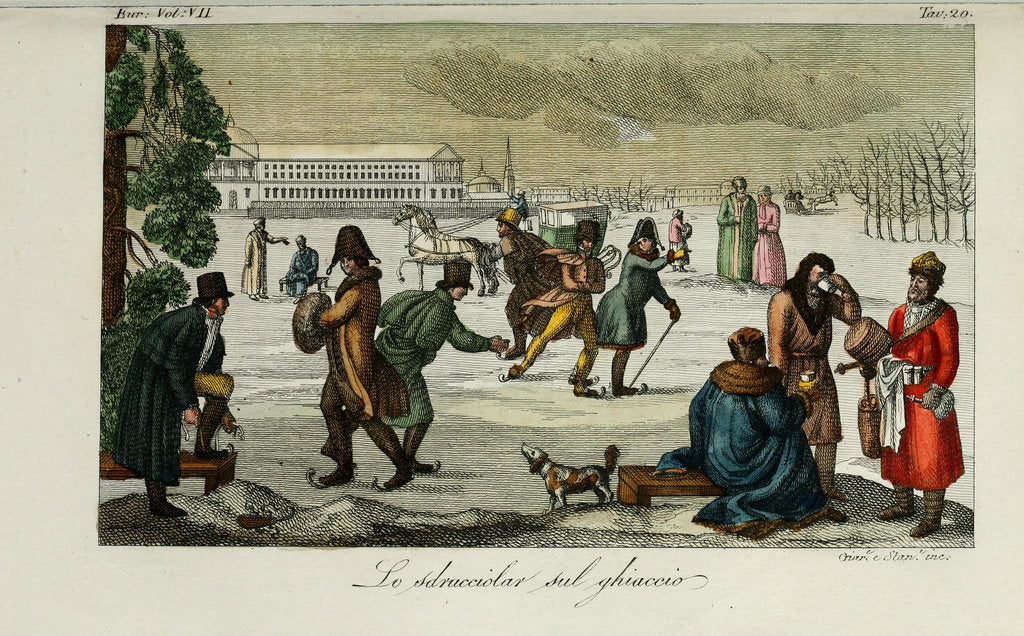 Skating rink. Illustration from Il costume antico e moderno o storia del governo? by Giulio Ferrario, 1831. From a private collection.