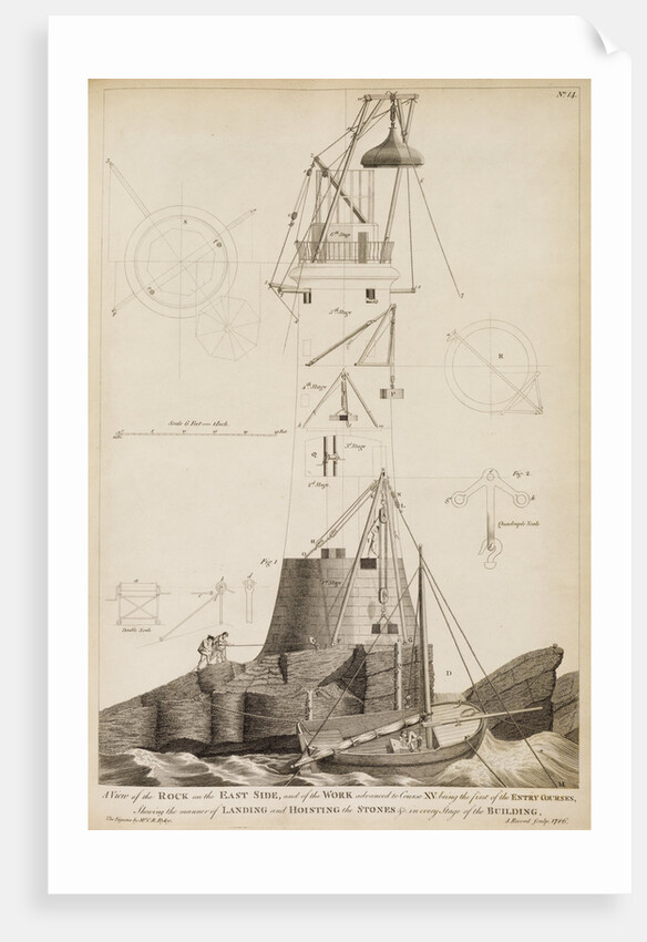 Depiction of the third lighthouse built upon the Eddystone Rocks, near Plymouth. The third lighthouse was built following the destruction of earlier versions designed by Henry Winstanley (1644-1703), and John Rudyard (or Rudyerd; 1650- ca.1718). The Royal Society recommended the civil engineer John Smeaton (1724-1792) for the job; his lighthouse was completed in 1759. Plate 14 of A narrative of the building and a description of the construction of the Edystone lighthouse with stone, by John Smeaton (London, 1791). The Royal Society's copy was donated by the author on 20 January 1791. The plate is inscribed: 'A View of the ROCK on the EAST SIDE, and of the WORK advanced to course XV, being the first of the ENTRY COURSES, Shewing the manner of LANDING and HOISTING the STONES etc in every stage of the BUILDING.' Includes scale: 1 inch = 6 feet