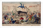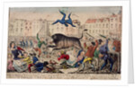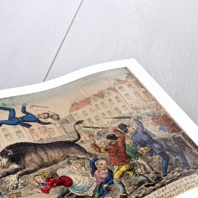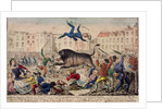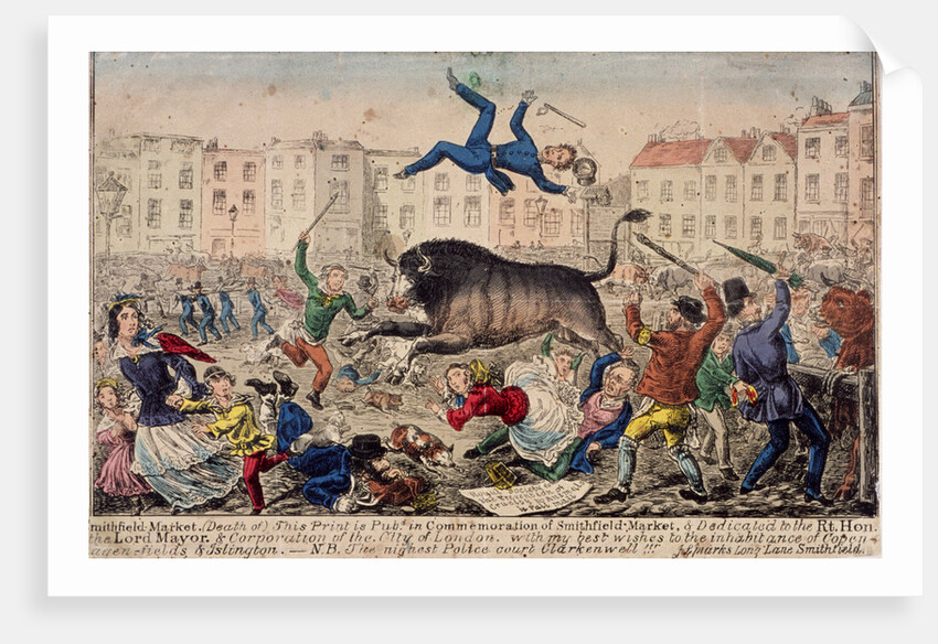 Smithfield Market, London, c1855. Scene of a bull rampaging through Smithfield Market, having just tossed a policeman into the air.