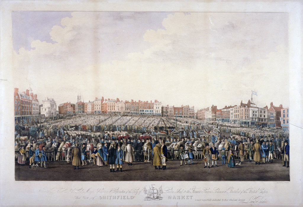 Smithfield Market, West Smithfield, City of London, c1825. View from the east showing cattle, traders and shoppers.