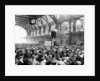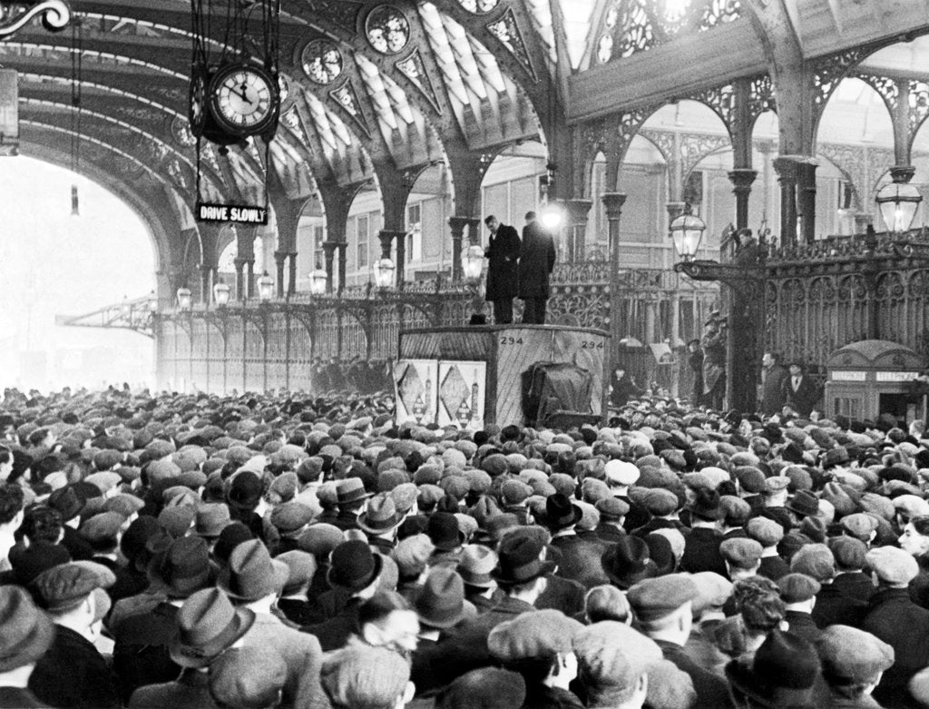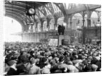 Meat Strike. A meeting in progress at Smithfield Meat market showing two delegates making a speech. They are Mr L Hanson, group secretary of the union and Mr S H Tribe. 4th February 1936.