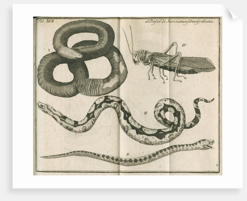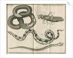 Snakes and a cricket from thesis XVI 'Surinamensia grilliana' by Petro Sundio, 1748, published in volume 1 of Amoenitates academicae (Stockholm, 1749). Amoenitates academicae ('Academic delights', 10 volumes, 1749-1790) was published in Carl Linnaeus's name, and edited by him (vols 1-7) and J C D Schreber (vols 8-10). It consisted of theses presented and defended by students at Uppsala University.
