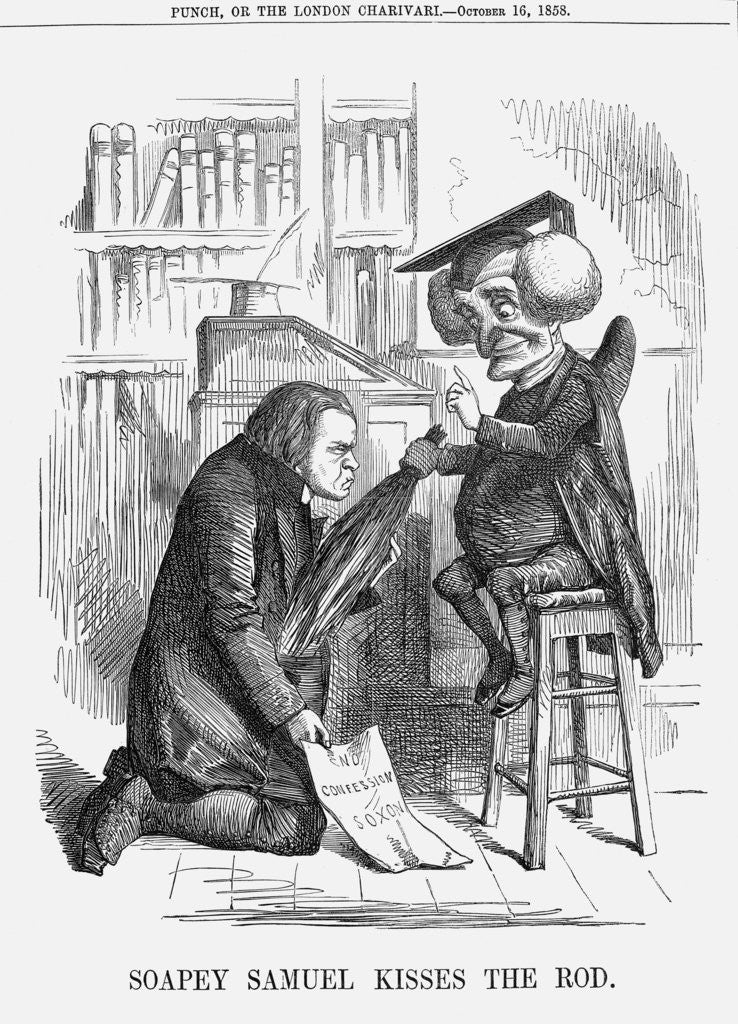 'Soapey Samuel Kisses the Rod', 1858. Samuel Wilberforce, Bishop of Oxford, was a reformer of the Church of England who dragged his priests into greater spirituality and efficiency. Wilberforce arranged conferences for his rural deans, travelled widely and increased the number of his parishes to be served by resident incumbents. Wilberforce had been suspected of countenancing auricular confession, although he denied this. However, his sympathy with Tractarian principles led to him being accused of a similar sympathy with Catholicism. Mr Punch is seen here in the role of schoolmaster chastising a truculent Wilberforce. Punch was firmly opposed to any ascendancy of the Catholic cause, and this opposition featured regularly in the journal's cartoons. From Punch, or the London Charivari, October 16, 1858.