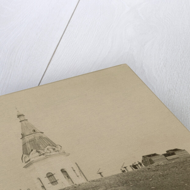 View of a temporary astronomical observatory outside the city of Krasnoyarsk, Siberia in Russia. Sheds and instrument platforms can be seen on the skyline grouped around an existing small church tower. The observatory was used to record the total solar eclipse visible in Russia on 7 August 1889. Extra-illustration pasted before the title-page of the book Eclipse totale du soleil...Aout, 1887....issued in Russian [title page also in French] by the SociÚtÚ physico-chimique Russe (St, Petersburg, 1889). The photograph is captioned below: "Station Ó Krasnoyarsk"