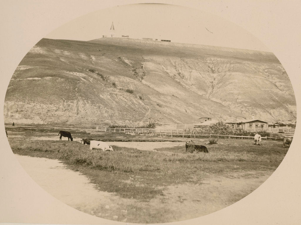 Landscape near the city of Krasnoyarsk, Siberia in Russia showing farmland with cattle in the foreground. In the distance is a ridge upon which a temporary astronomical observatory stands grouped around an existing small church tower. The observatory was used to record the total solar eclipse visible in Russia on 7 August 1889. Extra-illustration pasted before the title-page of the book Eclipse totale du soleil...Aout, 1887....issued in Russian [title page also in French] by the SociÚtÚ physico-chimique Russe (St, Petersburg, 1889). The photograph is captioned below: 'Vue generale de la Station'