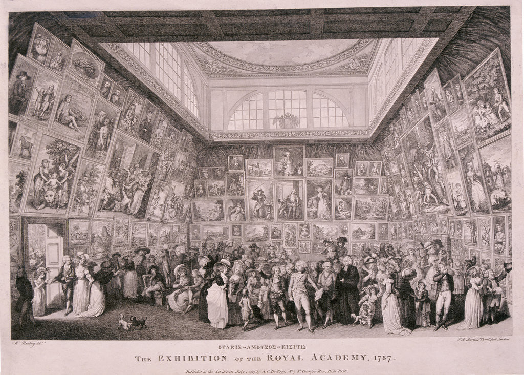 Interior view of Somerset House showing an exhibition of the Royal Academy of Arts in 1787, with paintings lining the walls from floor to ceiling and a large crowd of fashionably dressed figures viewing the works and conversing amongst themselves.