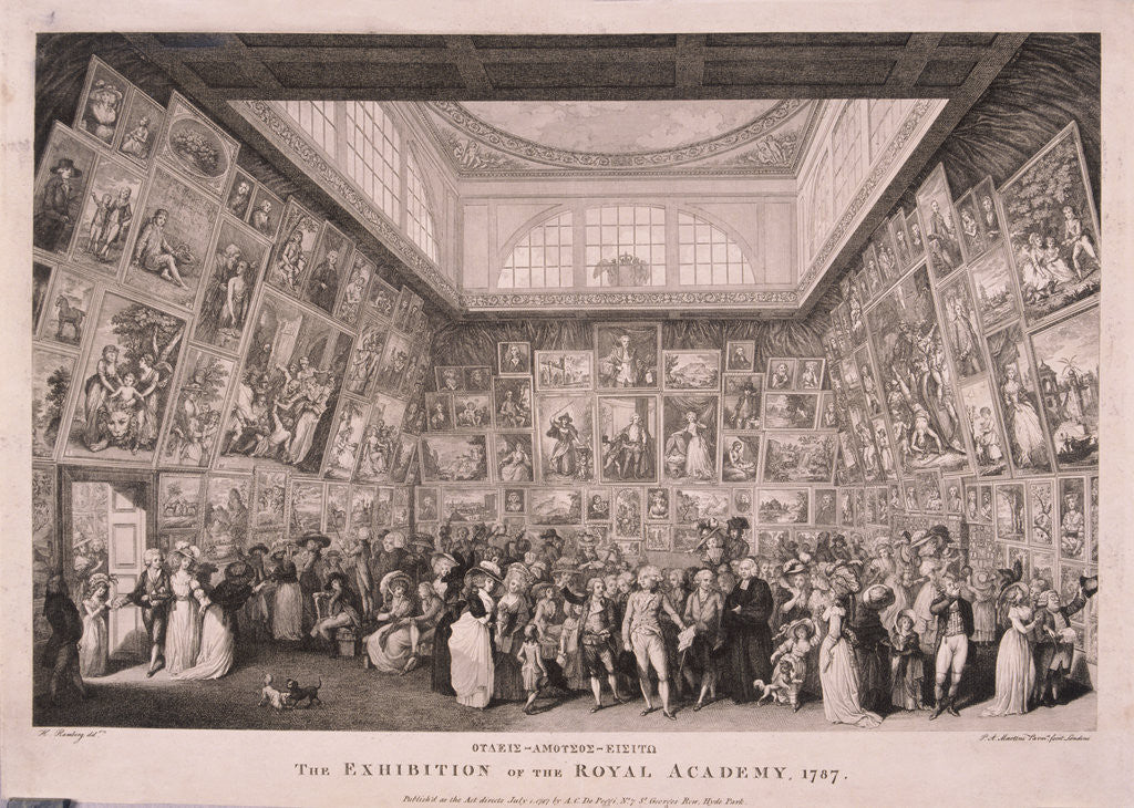 Interior view of Somerset House, Westminster, London, 1788; showing the Royal family viewing an exhibition of the Royal Academy of Arts in 1788. King George III and Queen Charlotte stand in the centre of the room with their children and courtiers, with paintings lining the walls from floor to ceiling around them.