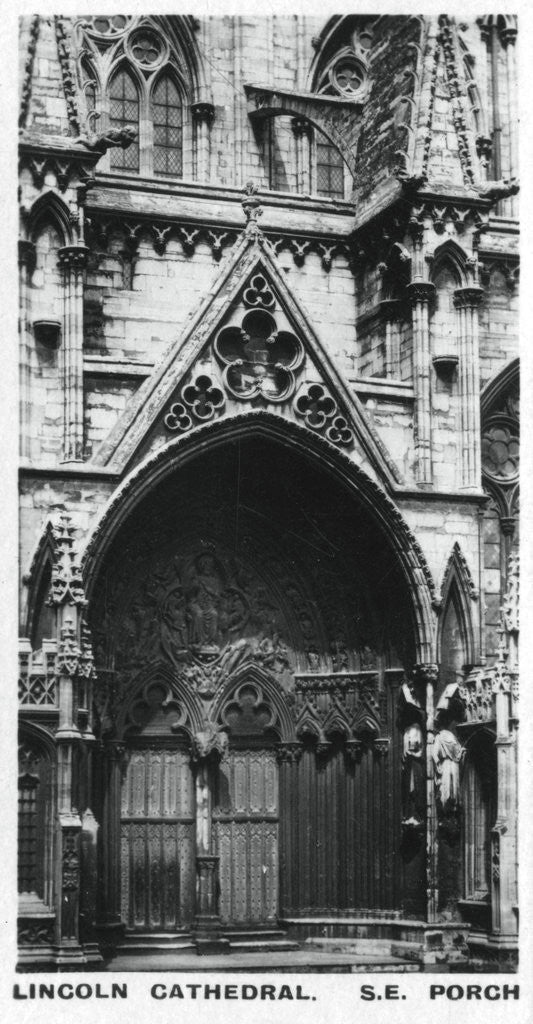 South east porch, Lincoln Cathedral, c1920s. In 1072 William the Conqueror ordered that a cathedral should be built at Lincoln. It was built by Bishop Remigius and was consecrated in 1092. The cathedral was damaged by fire in 1141 and by an earthquake in 1185. Most of the Gothic building which stands today dates from the 13th century. Cigarette card produced by the Westminster Tobacco Co Ltd, The second series of British royal and ancient buildings.