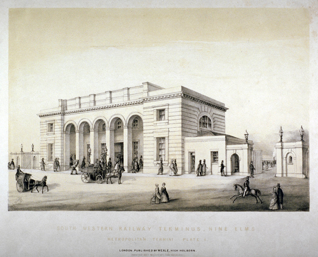 South Western Railway Terminus, Nine Elms, Battersea, London, c1840. The London and Southampton Railway was opened in 1838. Nine Elms was the original terminus, designed by Sir William Tite, which closed when the line was extended to Waterloo in 1848.