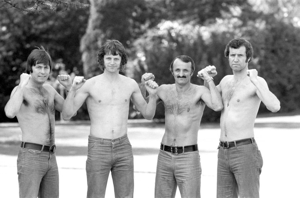 Cup Final Muscle. Southampton FC Players who have all previously played at Wembley. Jim McCalliog, Mike Channon, Peter Rodrigues & Peter Osgood. Demonstrate the mood and the muscle that they are sure will help them lift the Cup against Manchester United tomorrow. Pictured Thursday 29th April 1976.