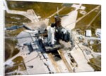 Space Shuttle Orbiter on the launch pad, Kennedy Space Center, Merritt Island, Florida, USA, 1980s. Aerial view. The Space Shuttle program, (official name, Space Transportation System or STS), was the fourth human spaceflight program carried out by the National Aeronautics and Space Administration (NASA), which accomplished routine Earth-to-orbit transport for crew and cargo between 1981 and 2011.
