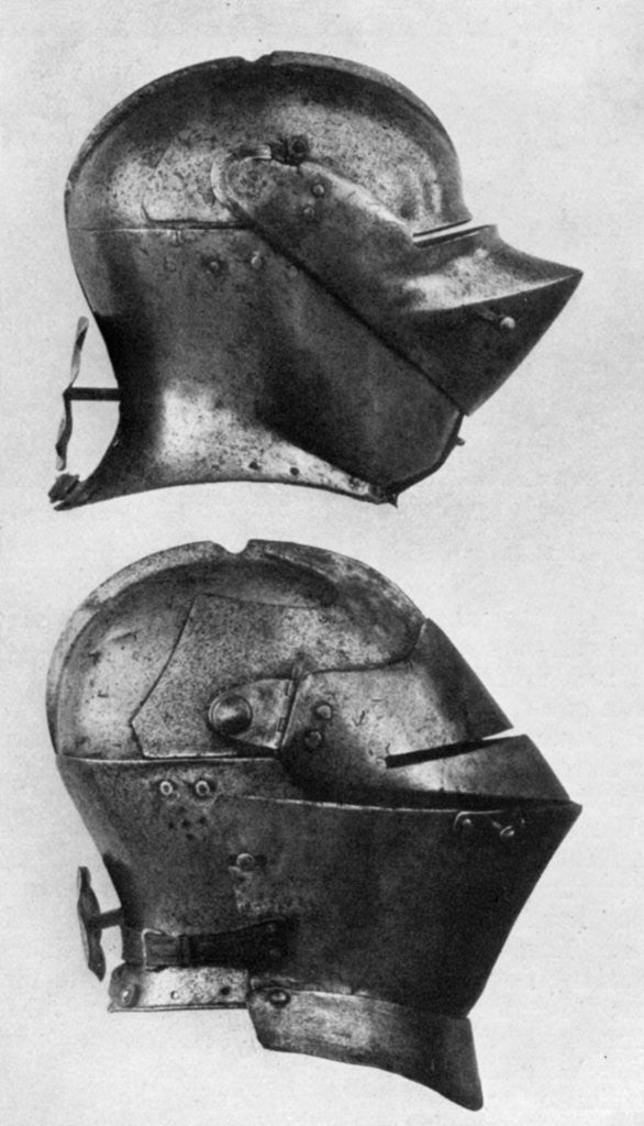 Spanish and Italian helmets, 15th century, (1929). 'A fine armet-a-rondelle, Spanish, end of the 15th century, and an Italian armet and tilting buff, mid 15th century'. Illustration from the Apollo Volume IX, no 53, (May 1929).