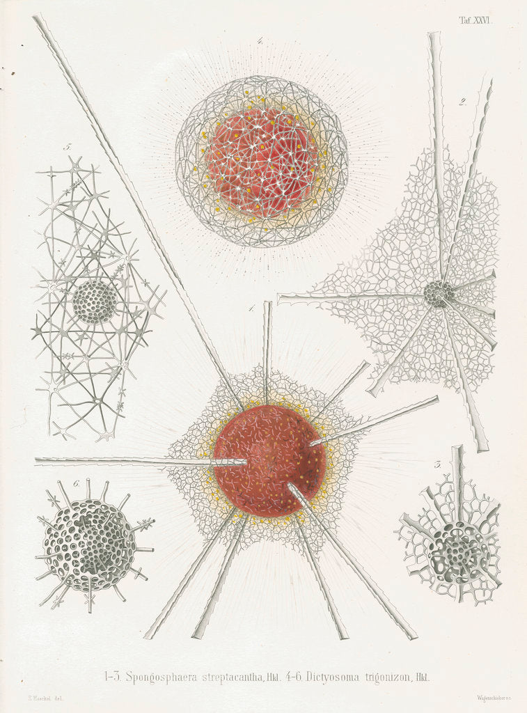 Spongosphaera streptacantha (figs 1-3) and Dictyosoma trigonizon (figs 4-6), classes of radiolarian (amoeboid protozoa that are found as zooplankton). Illustration from Die Radiolarien (Rhizopoda radiaria): eine Monographie: Atlas, by Ernst Haeckel (Berlin, 1862).