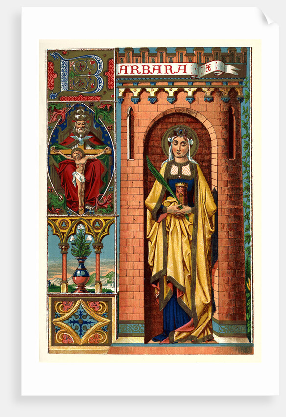 St Barbara, 1886. A Christian martyr who died c235, St Barbara was shut up in a tower to protect her from suitors. She is said to have put a third set of windows into the tower to represent the trinity. St Barbara is the Patron saint of arsenals and artillery and a protector against lightning. Published in Butler's Lives of the Saints, DIV 4, by the Rev Alban Butler, London & Dublin, 1886.
