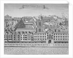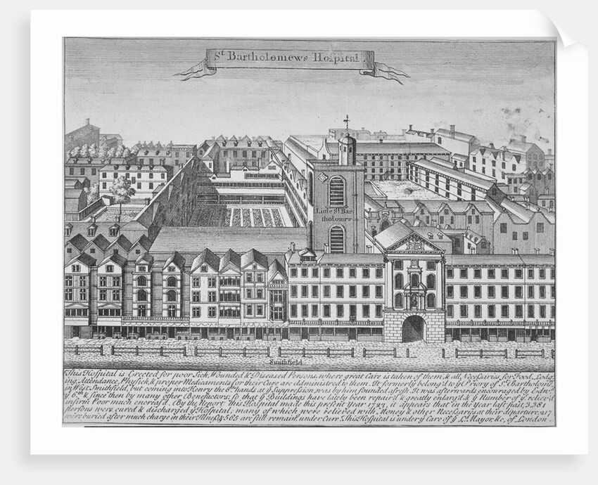 St Bartholomew's Hospital, Smithfield, City of London, 1723. St Bartholomew's Hospital was founded in 1123 by Rahere, the Prior of St Bartholomew's Priory, after he had a vision of the saint. The hospital is still operating today.