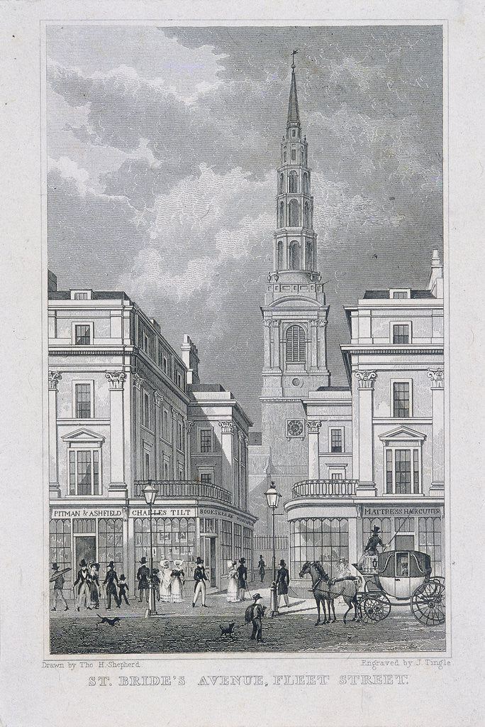 View of St Bride's Avenue with figures and a horse drawn carriage. Shop fronts include Charles Tilt's publisher and booksellers, and the premises of Pitman and Ashfield.