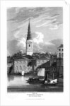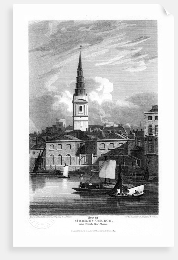 St Bride's Church, London, 1815. View of the church from the Thames. Built in 1672, St Bride's is one of Christopher Wren's churches built to replace those in the City of London destroyed by the Great Fire of 1666.