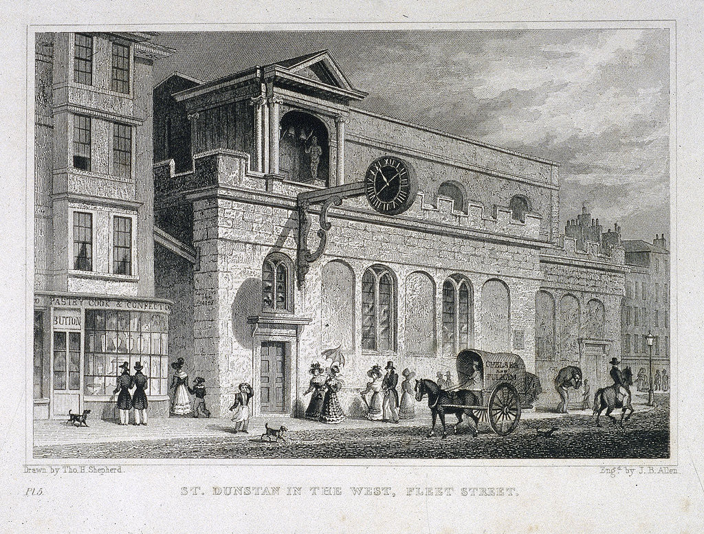 View of St Dunstan in the West, London, 1829. Street scene with figures and carriages.