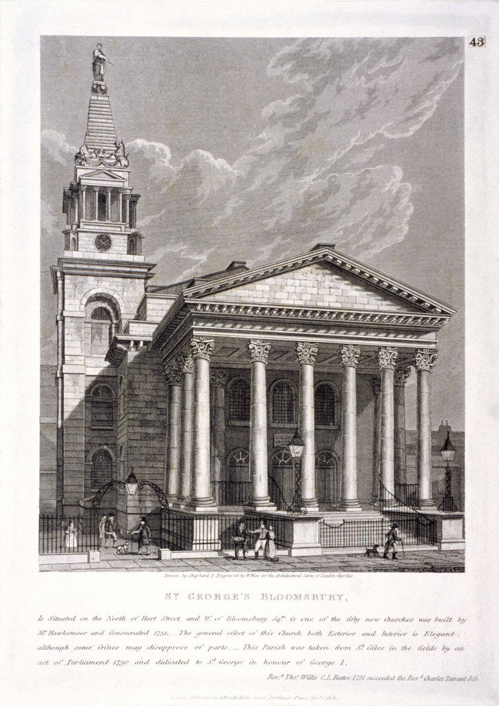 View of St George, Bloomsbury Way, Holborn, London, 1818; with figures in the foreground and a description in the lower margin.