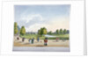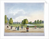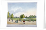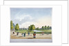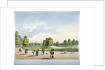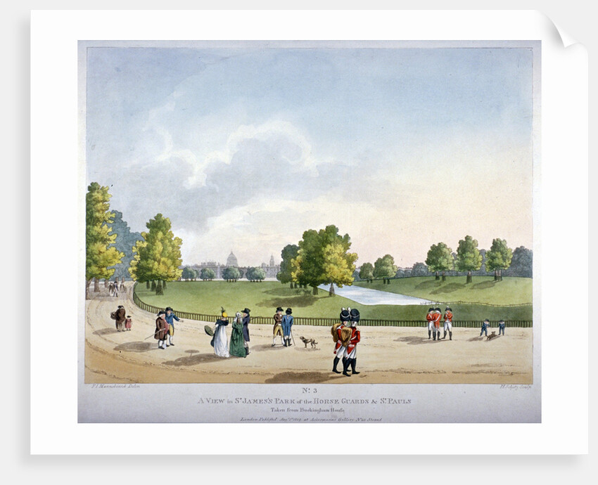 St James's Park, Westminster, London, 1809. A view in St James's Park of the Horse Guards and St Paul's, taken from Buckingham House, with figures and soldiers walking.