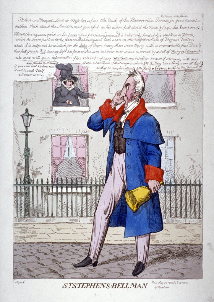 'St Stephen's Bell Man', 1820. Viscount Castlereagh, in a bell-man's caped coat, shouts outside Alderman Wood's house in South Audley Street. Queen Caroline replies from an open window.