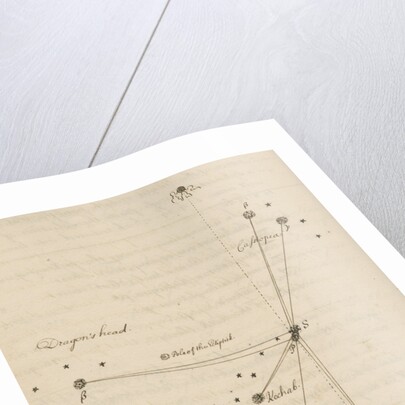 Star chart featuring a dotted plumb line through the North Star, Polaris, and the relative positions of Beta Draconis, Kochab [Beta Ursae Minoris], 'Eliot' [eg Alioth, Epsilon Ursae Majoris] with Beta and Gamma Cassiopeia. From the manuscript copy of 'The variation of the polar star determined in observing the hour of the night: or: the nocturnal rectified, designed as a great help to put in practice the theory of the longitude', by Mr T. Wright. Not signed. Royal Society Register Book Original, vol.19 1734-1736, pp.108-111. The paper was read before the Royal Society on 6 March 1734.