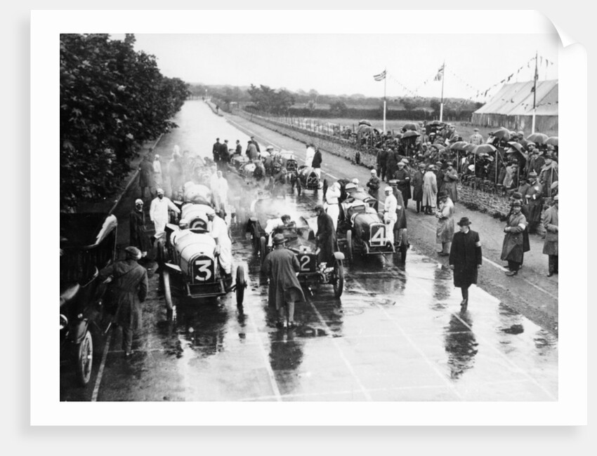 Start of a TT race, 1922. Cars are lined up on the starting grid in wet conditions. The car on the left-hand side is a Bentley and the car in the centre is a Vauxhall.