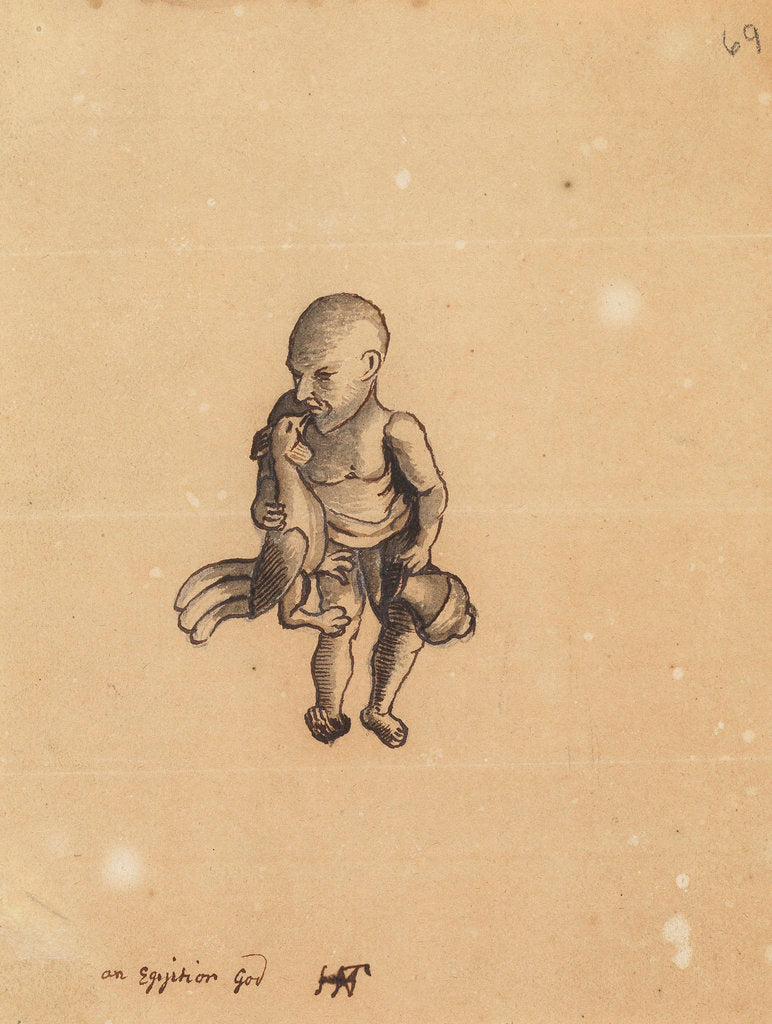 Study of a statuette [?] showing a bald male figure holding a cockerel and a drinking vessel. Inscribed below: 'an Egiptian God' and with the monogram of Henry Hunt, Operator for the Royal Society.