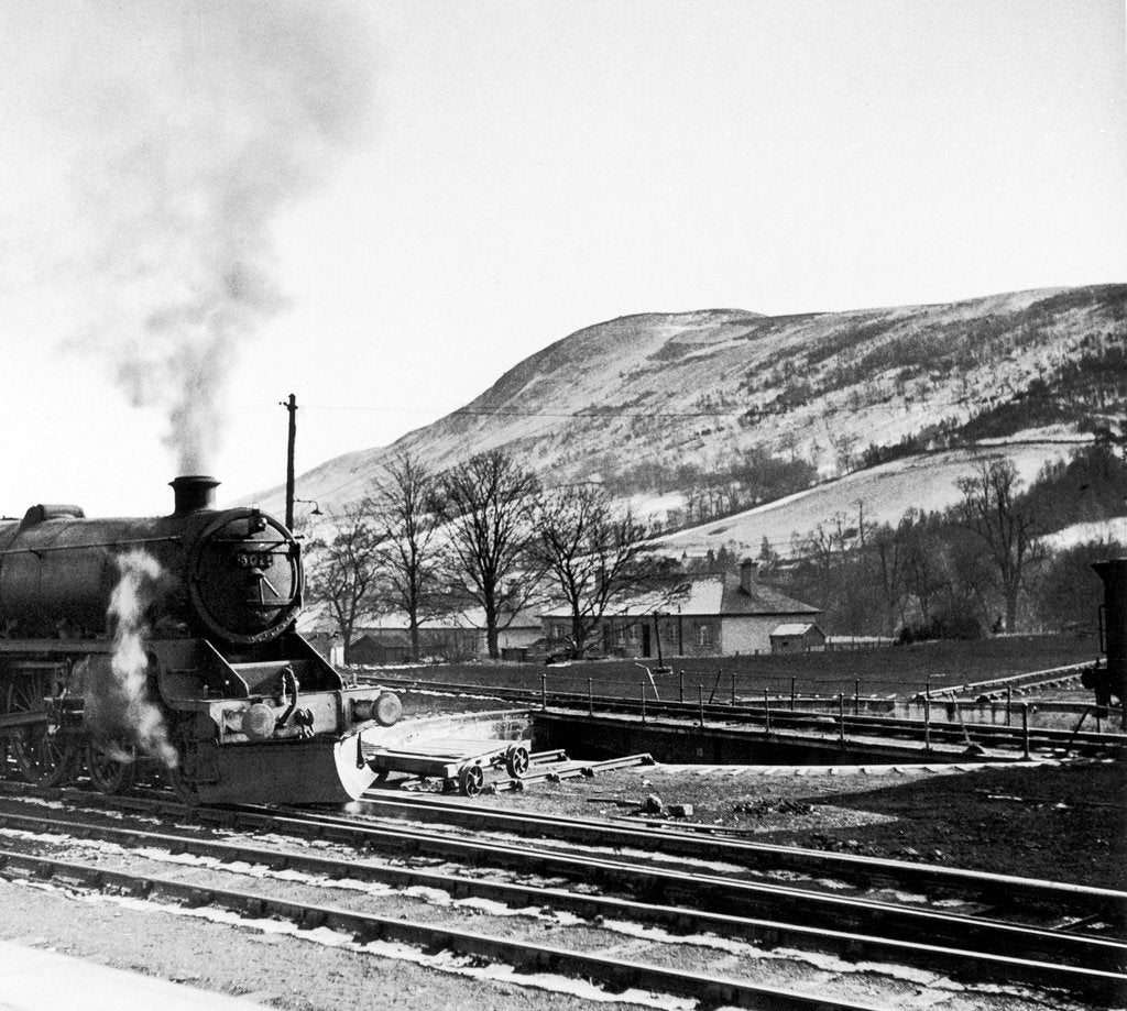 Steam train leaves Blair Atholl on the railway route from Perth northwards to Forres in Morayshire, Scotland, passing through the Grampian mountain range. Circa 1947.