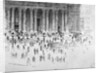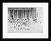 Steps outside the west front of St Paul's Cathedral, City of London, 1900. People on the steps and around the statue of Queen Anne.