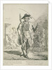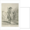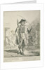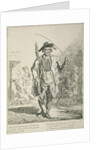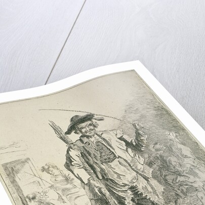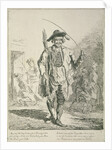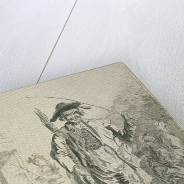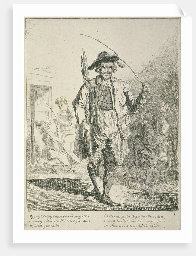 Stick seller, 1760. A ragged stick seller and two background views; to the left a woman is holding a stick over her kneeling husband and twisting his nose, and to the right a husband is beating his wife with a stick he has presumably just purchased from the stick seller. The text below suggests wife-beating and clothes-cleaning as two uses of the stick. From Cries of London, 1760.