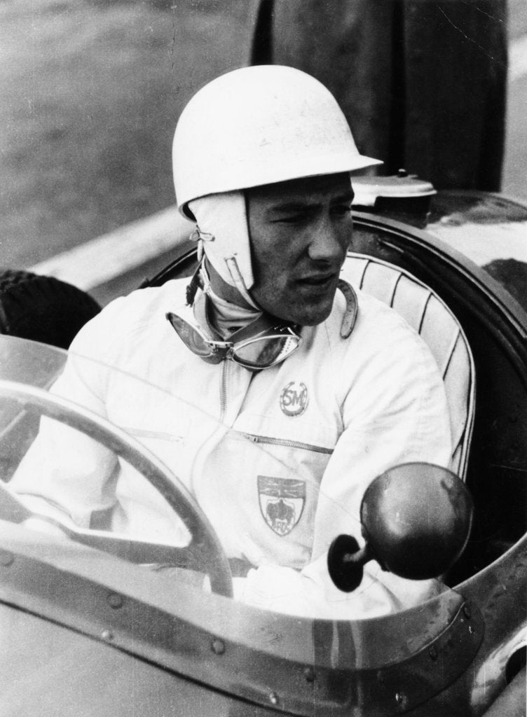 Stirling Moss at Goodwood, 1954. At the wheel of a Maserati, Moss came first in this race. He began his career in 1947 driving a BMW 328. In 1955 he won his first Grand Prix at Aintree driving a Mercedes, and in 1956 went on to win the Monaco and Italian Grands Prix driving for the Maserati team. In 1957 he was team leader in a British Vanwall, and beat the Maserati and Ferrari teams at Monza in the Italian Grand Prix. He drove Coopers and Lotuses through to 1961, and retired after an accident at Goodwood in 1962.