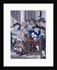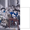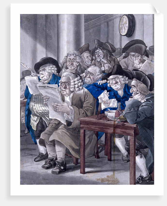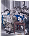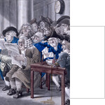 'Stock-Jobbers Extraordinary', c1795. Interior of the Stock Exchange, Bartholomew Lane, showing some members seated a around a table studying the Gazette Extraordinary while others appear to be taking notes from a blackboard. A bottle has tipped over in the foreground spilling drink.