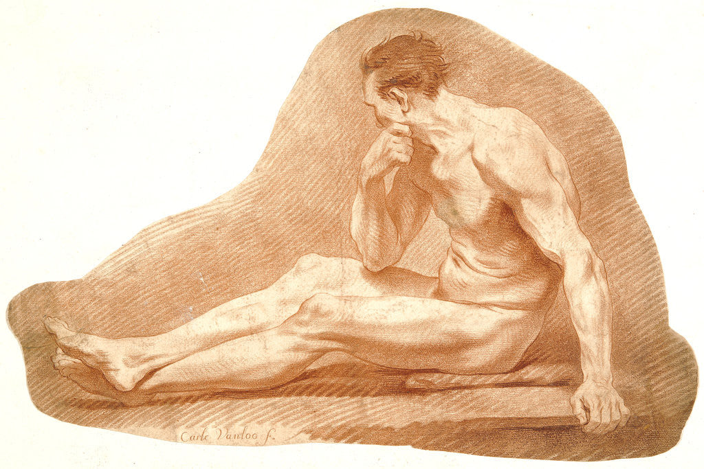 After Carle van Loo (aka Carle Vanloo) (French, 1705-1765). Study of a Male Nude, ca. 1743. Etching in the crayon manner printed in red-brown ink on heavy laid paper glued on laid sheet