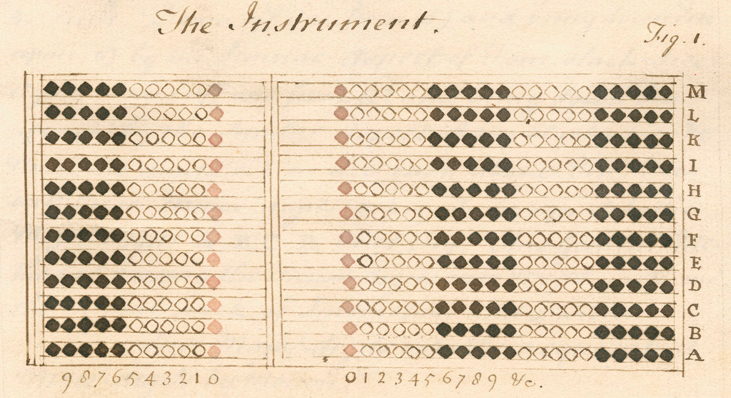 Abacus-like mathematical instrument consisting of 384 moving squares intended for calculation. The author indicated that 'The Quickest Operation upon this Instrument, is by a New Method of Infinite Series, called the Decimal Series....' The first of six figures from the paper 'The arithmetic of the superdigit', by Robert Flower, signed and dated on 18 April 1742 [but endordsed 1741] and sent to the Royal Society. Not published in Philosophical Transactions of the Royal Society. In addition to this paper, Flower also demonstrated his invention at the Spalding Gentlemen's Society in 1739. Robert Flower was not a Fellow of the Royal Society.