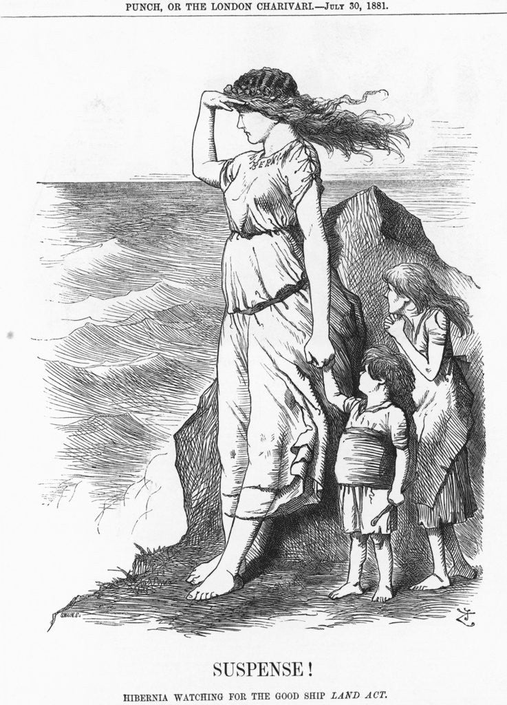 'Suspense', 1881. Hibernia, with two Irish children, awaits the forthcoming Land Reform Act. This was introduced by the Liberal Prime Minister, Gladstone, and proposed that Irish tenant farmers should have fixity of tenure. It also established a new land court to assess rents. From Punch, or the London Charivari, July 30, 1881.