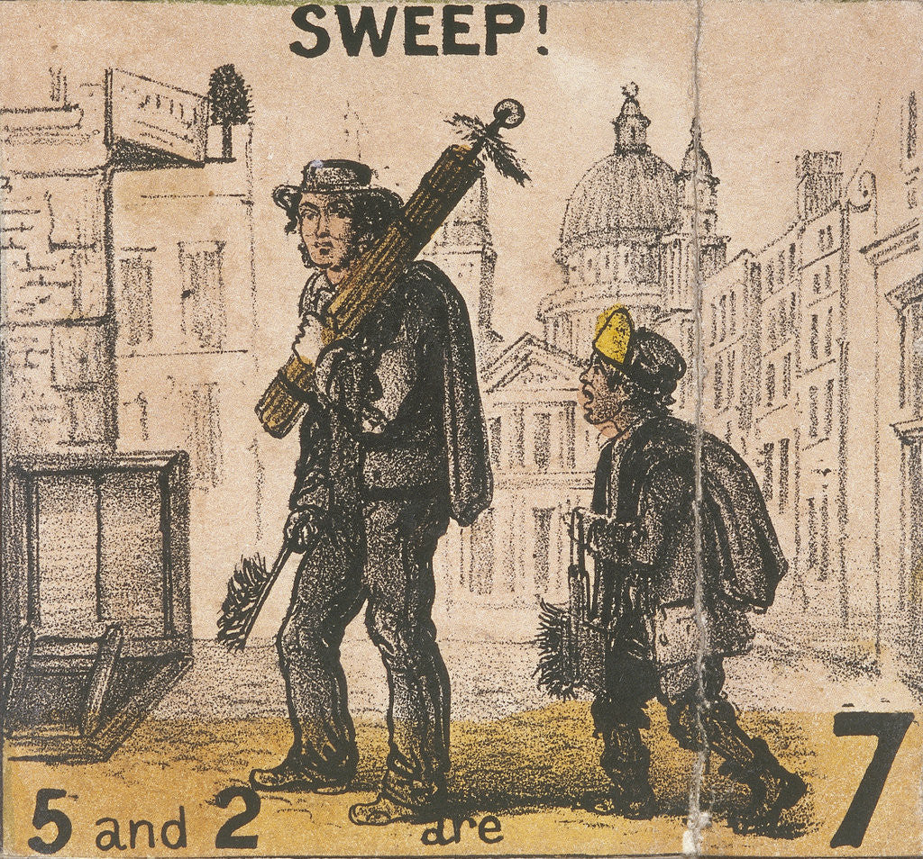 'Sweep!' A view of two chimney-sweeps walking along the street, their brooms slung over their shoulders, with the dome of St Paul's Cathedral in the distance. From Cries of London, c1840.