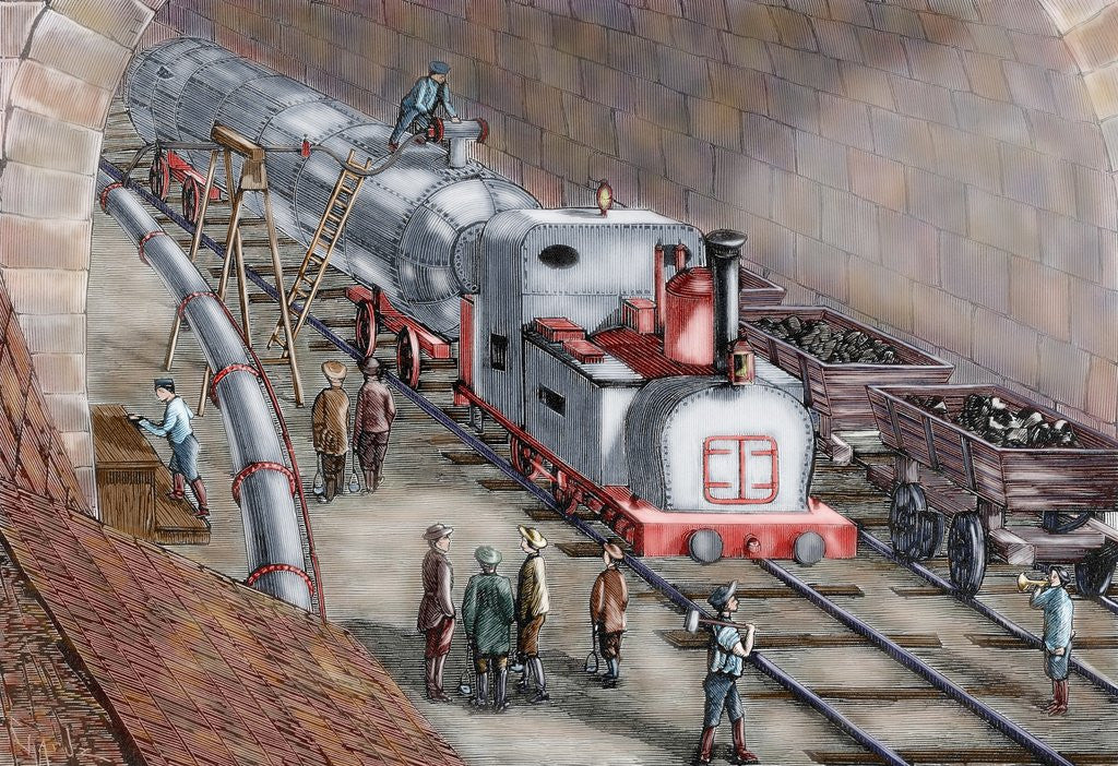 Switzerland. 19th century. Locomotive driven by compressed air used for the drilling of Saint-Gothar