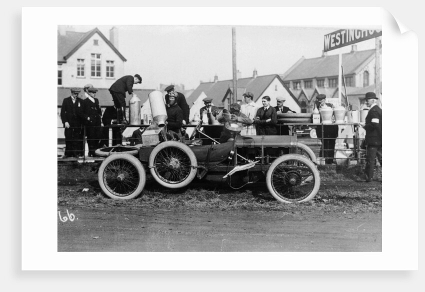 T Thornycroft with his Thornycroft car at a TT race, 1908. The car is being worked on by mechanics. Thornycroft finished 5th.