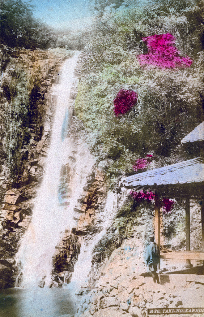 Taki-no-kannon, Japan. (Mercy of Goddess at Waterfall) site of the Kyojunji Temple. Hand-tinted picture postcard.