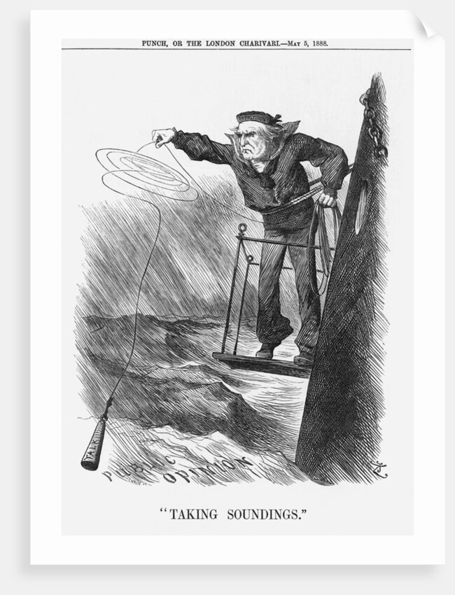 Taking Soundings, 1888. The Liberal Leader of the Opposition, Mr Gladstone, is on board ship and taking soundings of recent public opinion. Although there would not be a further General Election until 1902, Gladstone persistently kept trying to assess when he should try and force the Government to go to the country. From Punch, or the London Charivari, May 5, 1888.