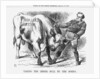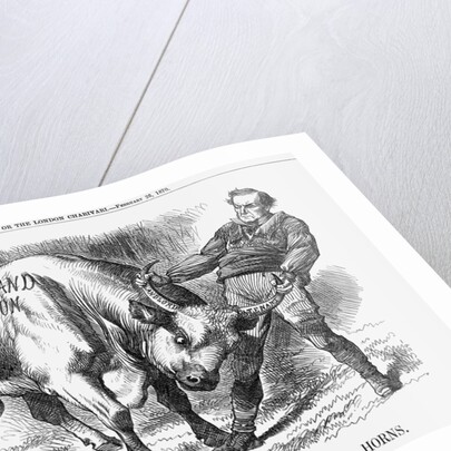 'Taking the (Irish) Bull by the Horns', 1870. Mr Gladstone, the Liberal Prime Minister, takes the Irish bull by the horns. The particular issue illustrated by this cartoon is the Irish Land Bill which Gladstone had introduced to the Commons in mid February 1980. Its principal aims were to provide compensation for evicted tenants, with restraint on evictions and the establishment of courts of arbitration. Naturally, the interests of the landlords and the tenants would be in opposition, an opposition that long been the basis of much unrest in Ireland. From Punch, or the London Charivari, February 26, 1870.