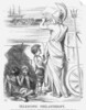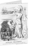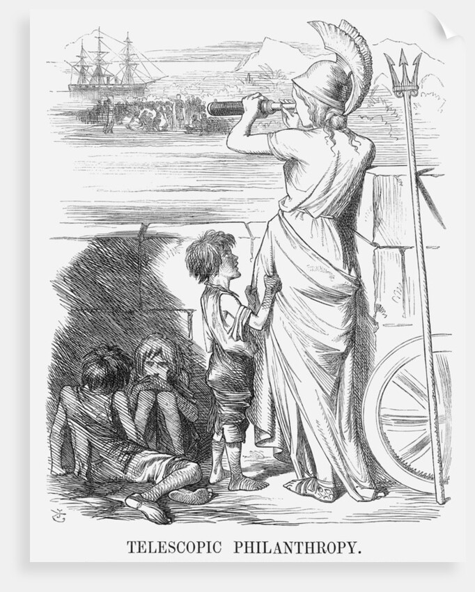 'Telescopic Philanthropy', 1865. 'Little London Arab. Please 'M, Ain't We Black Enough to be Cared For? (With Mr. Punch's Compliments to Lord Stanley.)' In his novel, Bleak House, Dickens had highlighted and satirised the growing numbers of the middle classes who expended much time, effort and money on raising funds to 'civilise' (particularly black) foreign peoples, rather than concentrating on the problems of the poor at home. This 'telescopic philanthropy' was epitomised by Mrs Jellyby in Bleak House, but here is represented by Britannia who has her eyes fixed so firmly on the distant horizon that she fails entirely to see the three children at her feet who, like Dickens' Jo, represent the estimated 30,000 homeless children living on the streets of London. From Punch, or the London Charivari, March 4, 1865.
