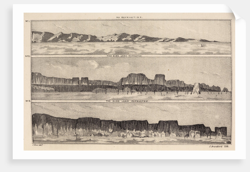 Plate illustrating John Ross's report of the curious effects of refraction in Arctic latitudes. The observations were made on 22 September 1832 at North End Cape, Somerset Island, in the Canadian Arctic. Figure 1 shows the land 'as with no refraction, distant fourteen miles'; figure 2 shows 'the same land, with an iceberg four miles distant raised above the land'; figure 3 shows 'the same refracted in a different way on the same day.' Plate facing p.cix of the Natural History appendix to the Narrative of a second voyage in search of a north-west passage, and of a residence in the Arctic regions during the years 1829 ... 1833, by Sir John Ross (London, 1835). John Ross and his nephew James Clark Ross endured four winters trapped in the Arctic ice on an expedition to find the elusive Northwest Passage. John Ross was knighted in 1834 following his return to England.