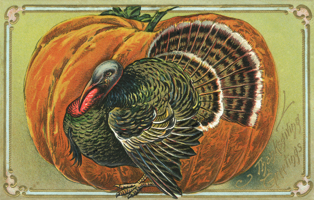 Thanksgiving Greetings Postcard with a Turkey and Pumpkin