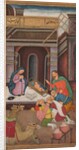 The Adoration of the Magi, from a Mirror of Holiness (Mir?at al-quds) of Father Jerome Xavier, 1602-1604. In this Nativity scene, familiar in Christian contexts, Mary and Joseph present the infant Jesus to the three Magi, who have placed their crowns on the ground in homage to the King of Kings. The three Magi are portrayed in Portuguese costumes to indicate to a Mughal audience that they are foreigners who believed in Christ. The artist cleverly and humorously indicates that the Magi have just arrived in Bethlehem by depicting their three camels in the bottom corner. One exhausted camel?s tongue hangs out the side of his mouth, while the other two animals lean eagerly toward a pair of water jugs.