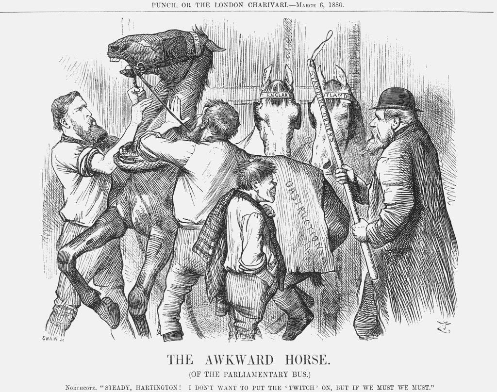 'The Awkward Horse', 1880. Sir Stafford Northcote, the Conservative Chancellor of the Exchequer advances with the twitch upon the Irish Horse, which the Liberal Marquis of Hartington is trying to calm. Sir Stafford had recently presented a proposal for ridding the political system of obstruction, the use of which had been causing the Conservatives so much difficulty during the last couple of Sessions. The proposal gave the Speaker the authority to decide what constituted obstruction, and then to suspend the offender. The proposal was firmly supported by members of the Opposition, such as Gladstone and Spencer Compton Cavendish . From Punch, or the London Charivari, March 6, 1880.
