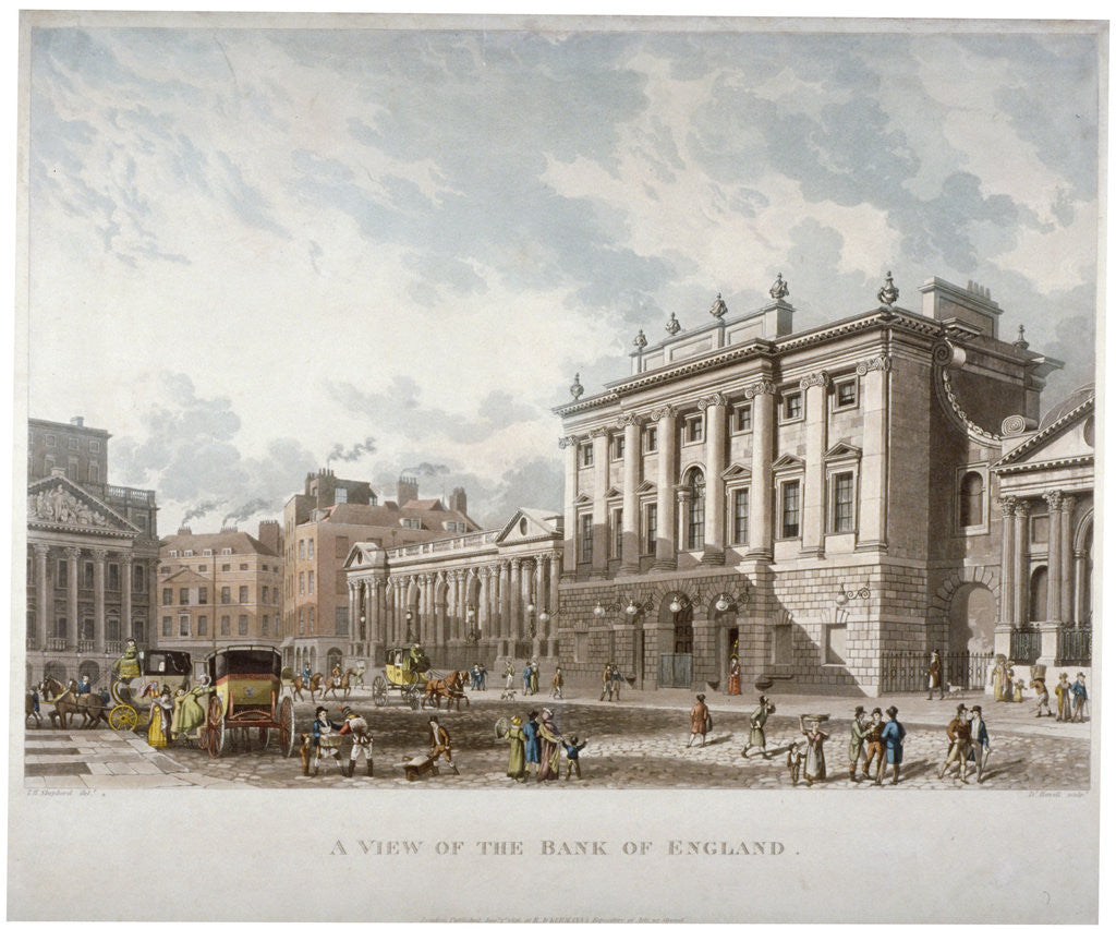 The Bank of England, City of London, 1816. View with figures, horses and carriages in Threadneedle Street.
